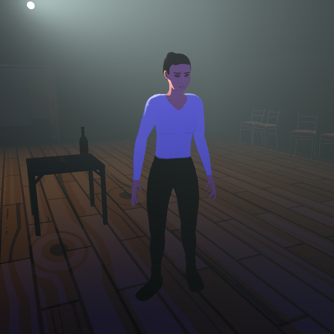 The projector in this room! I'm quite happy with the way the visuals of this scene have come together. In previous posts I've mentioned the fact that barely any lights in this game cast real-time shadows on objects—most of the 'shadows' you see are manually mapped on a UV layer by yours truly, or just a dark ambient light pretending to be a shadow. It's a stylistic choice, but also has to do with performance and optimization, since I'm currently sitting at about 200 lights right now. I'll enable shadows on particular lights in rare cases like this when I think it'll make a big difference visually, but otherwise I adhere strictly to my no-dynamic-shadows rule.