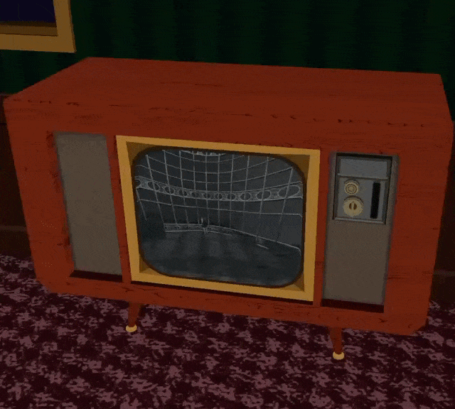 Let's do some show-and-tell. This guy sits down and turns on the television, and we can see footage on the screen which is actually streaming live from elsewhere in the building. He can turn the screen on and off as well as change the channel.